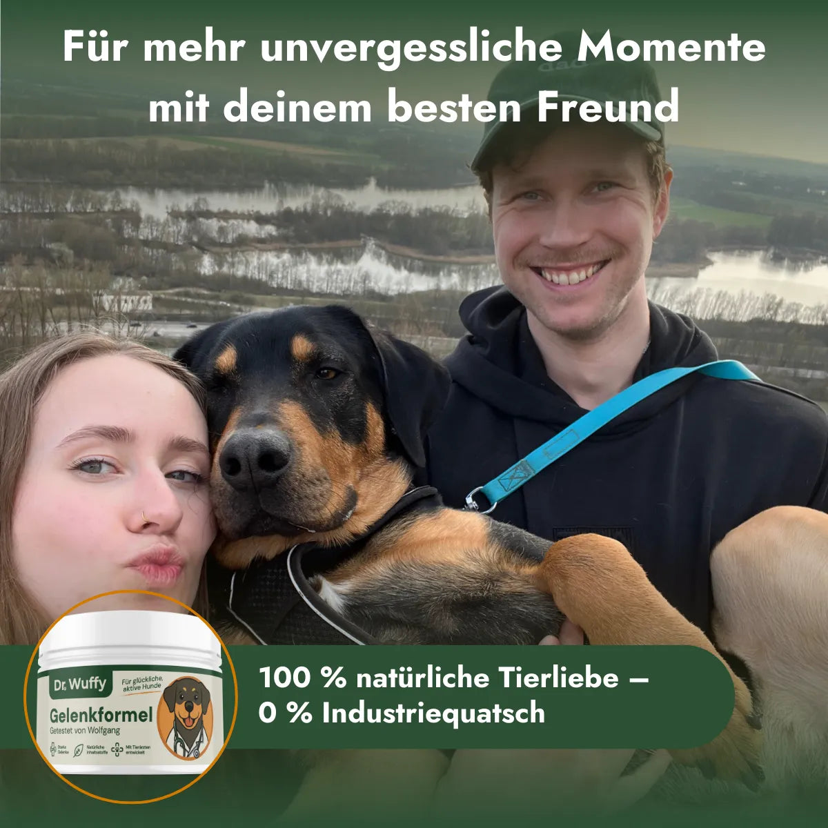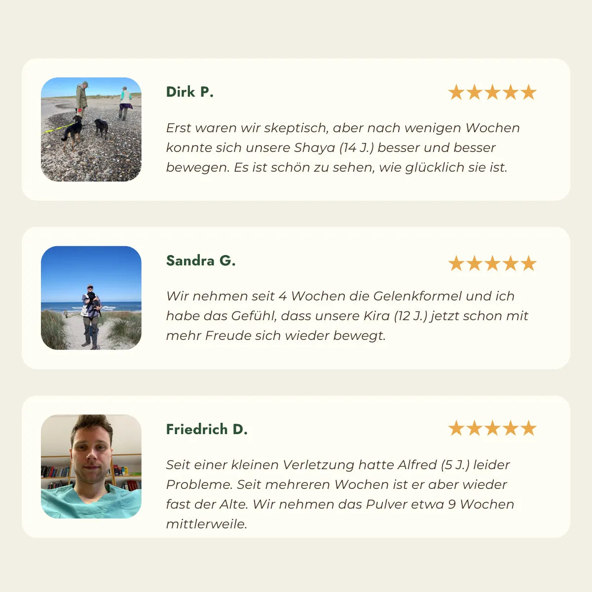 Viele Hundebesitzer berichten schon nach wenigen Wochen über positive Veränderungen: Ihr Hund wirkt vitaler, zeigt mehr Freude an Bewegung und ist wieder aktiver im Alltag. Unsere Formel ist frei von künstlichen Zusätzen und wurde mit viel Liebe und wissenschaftlicher Sorgfalt entwickelt – natürlich getestet von Wolfgang!