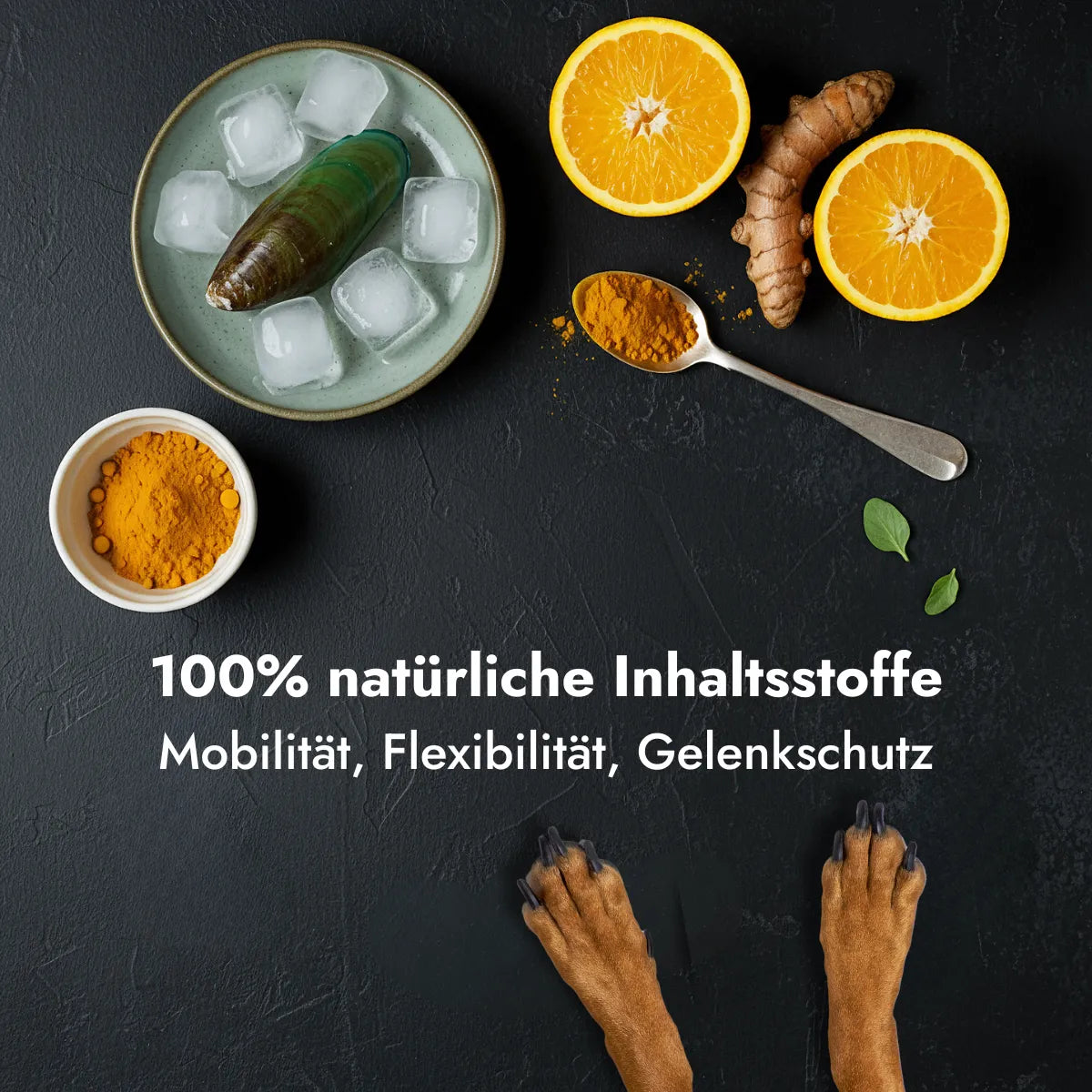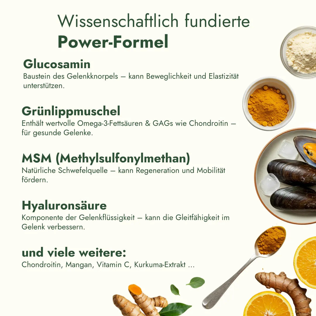 Die Formel enthält hochdosiertes Glucosamin, Chondroitin, MSM und Grünlippmuschel – alle bewährten Wirkstoffe für die natürliche Unterstützung der Gelenke beim Hund.