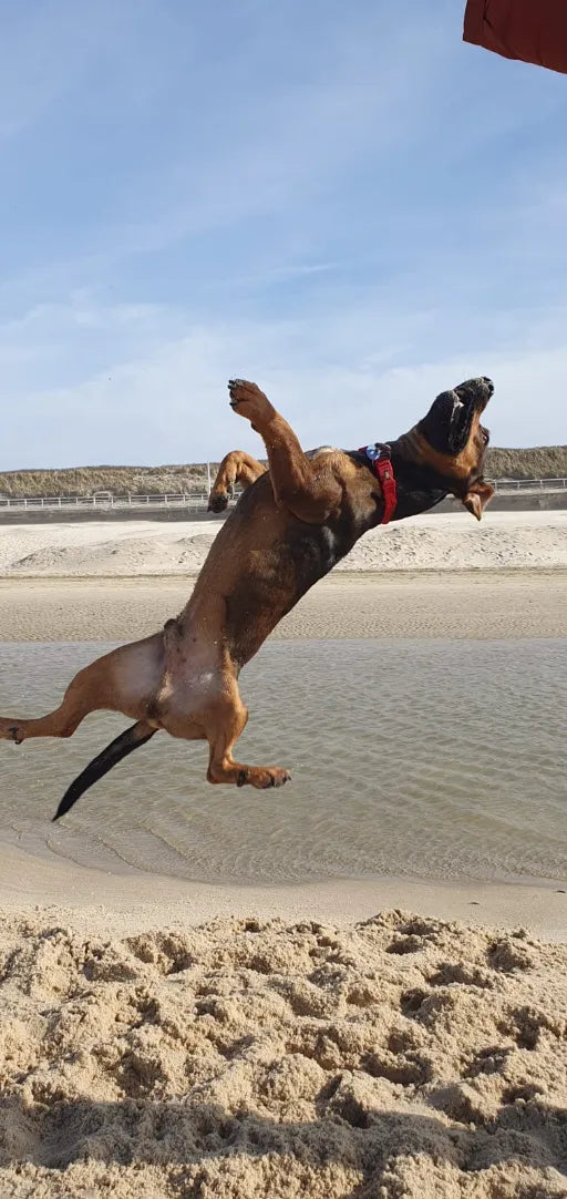 Endlich fliegt er wieder durch die Luft. Früher war unser Alfred ein kleiner Flitzer und konnte endlos spielen. Seit einer kleinen Verletzung hatte er leider Probleme. Seit mehreren Wochen ist er aber wieder fast der Alte. Wir nehmen das Pulver etwa 9 Wochen mittlerweile.
